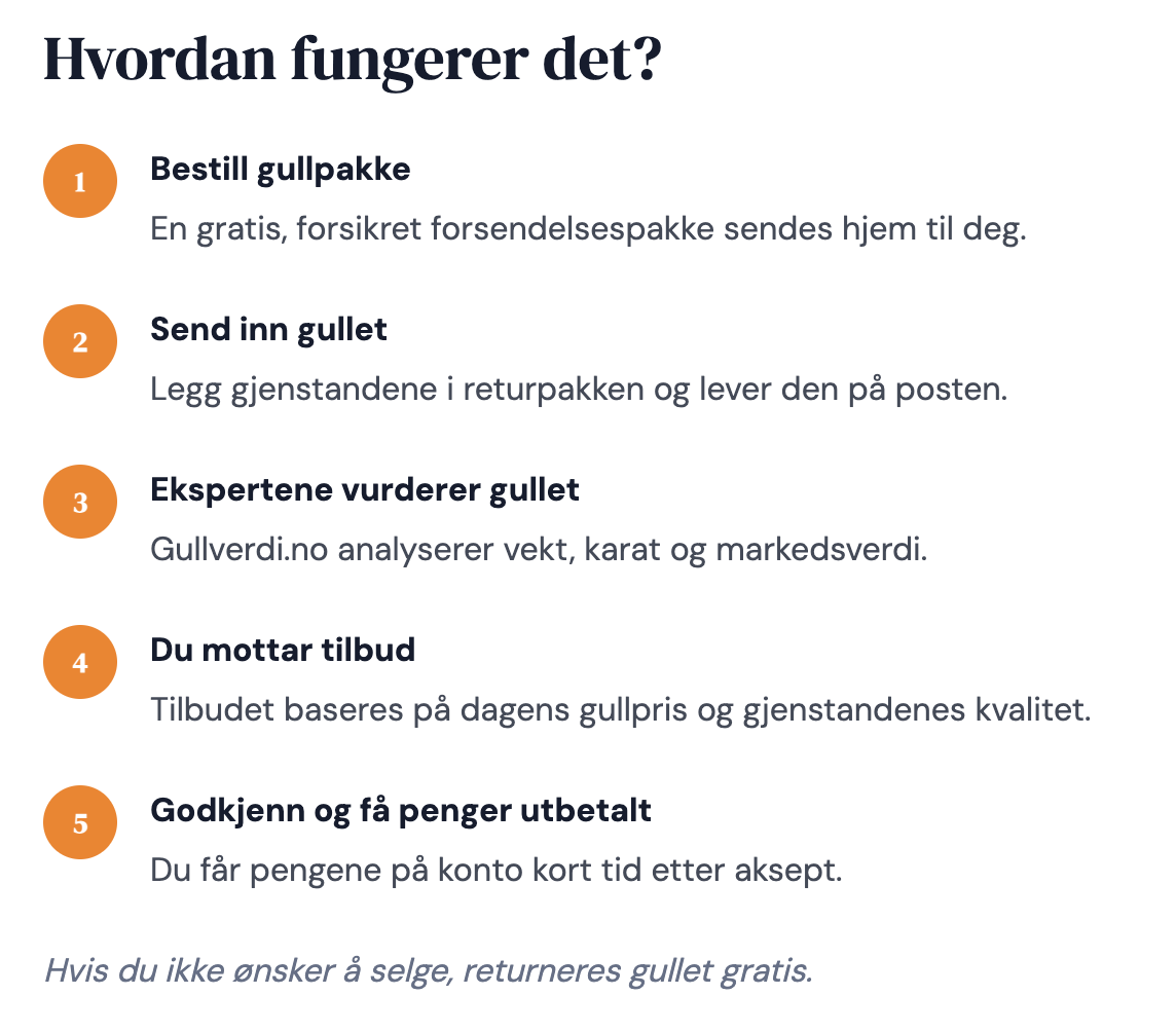 Gullverdi er en norsk tjeneste som tilbyr privatpersoner muligheten til å selge gull på en enkel, trygg og lønnsom måte. Tjenesten dekker alt fra ringer, halskjeder og armbånd til gullmynter, dentalgull og gullbarrer. Med gratis frakt, ingen gebyrer og markedets beste priser, har Gullverdi raskt blitt et populært valg for nordmenn som ønsker å få verdi ut av gullgjenstander de ikke lenger bruker.