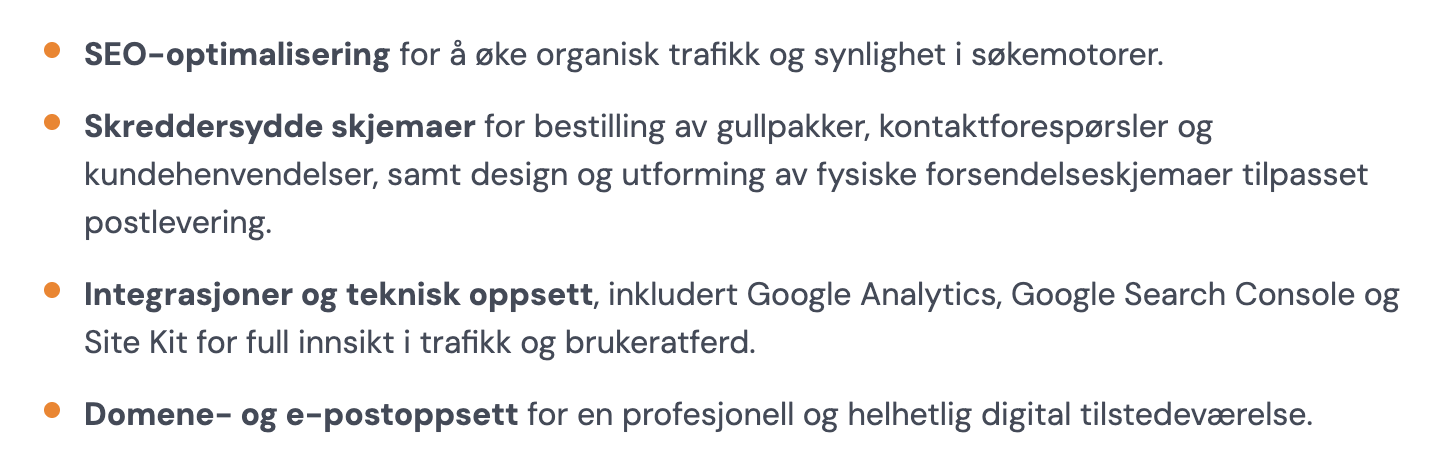 I tillegg til selve nettsiden har vi levert en rekke tjenester som sikrer langsiktig vekst og synlighet: